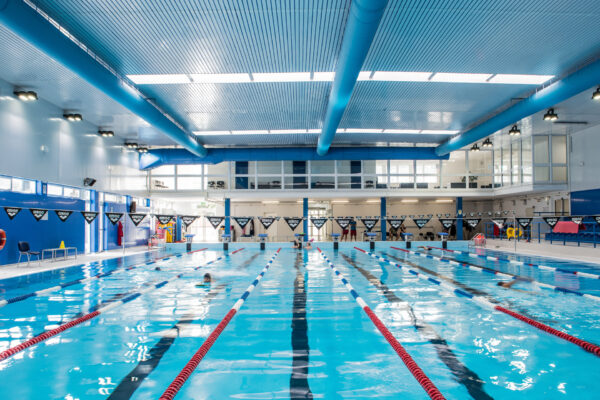 Éclairage de la piscine municipale couverte de Tolentino réalisé grâce à des projecteurs LED pour installations sportives à haute efficacité énergétique.